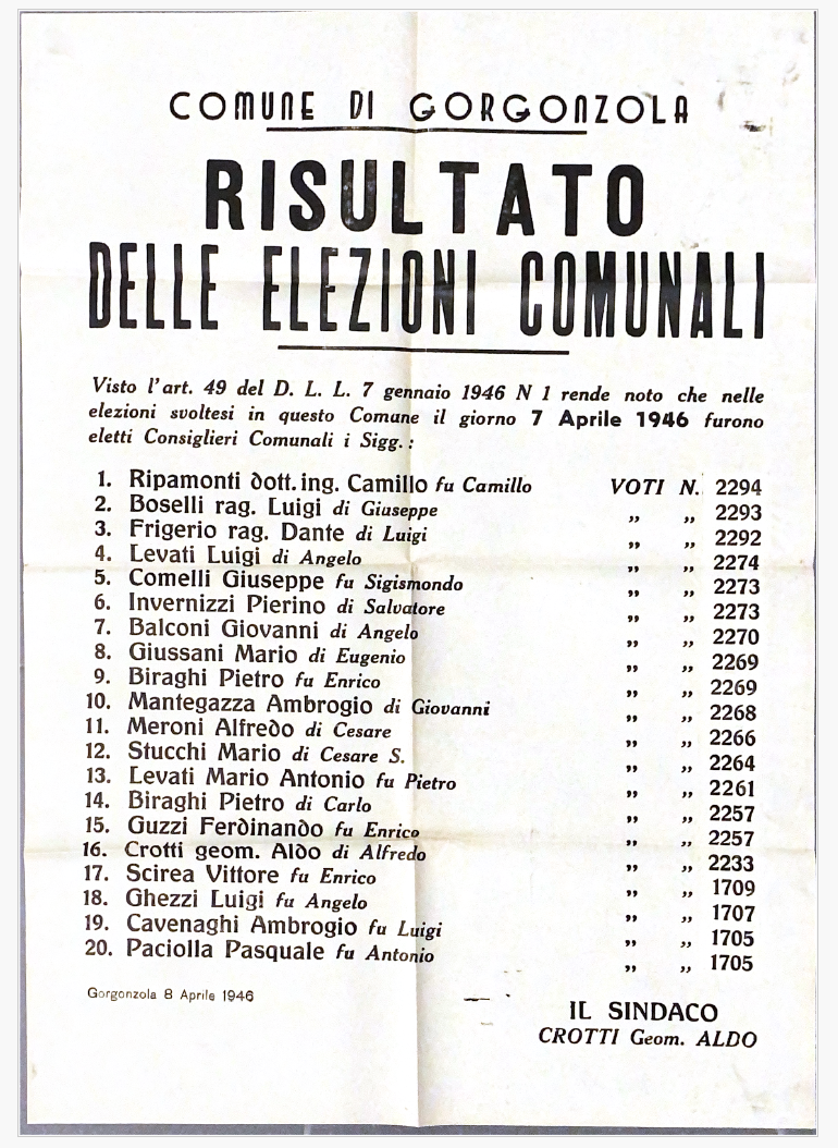 Il candidato più votato fu il dott. ing. Camillo Ripamonti, con 2.294 preferenze, che divenne il primo sindaco di Gorgonzola nel dopoguerra.