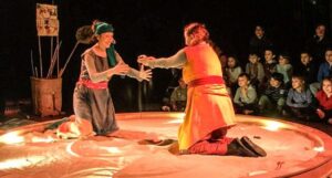 La storia di Hanà e Momò è quella di due bambine che sedute l’una di fronte all’altra all’esterno di un grande cerchio fatto di sabbia, si ritrovano a giocare escogitando fantasiose invenzioni.