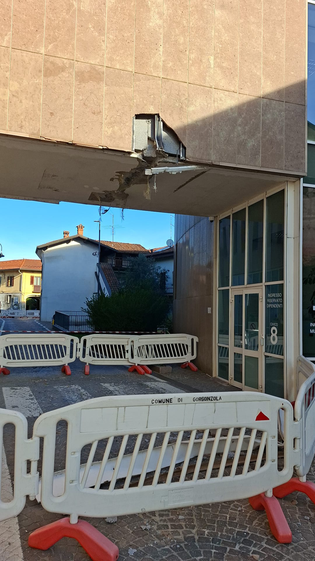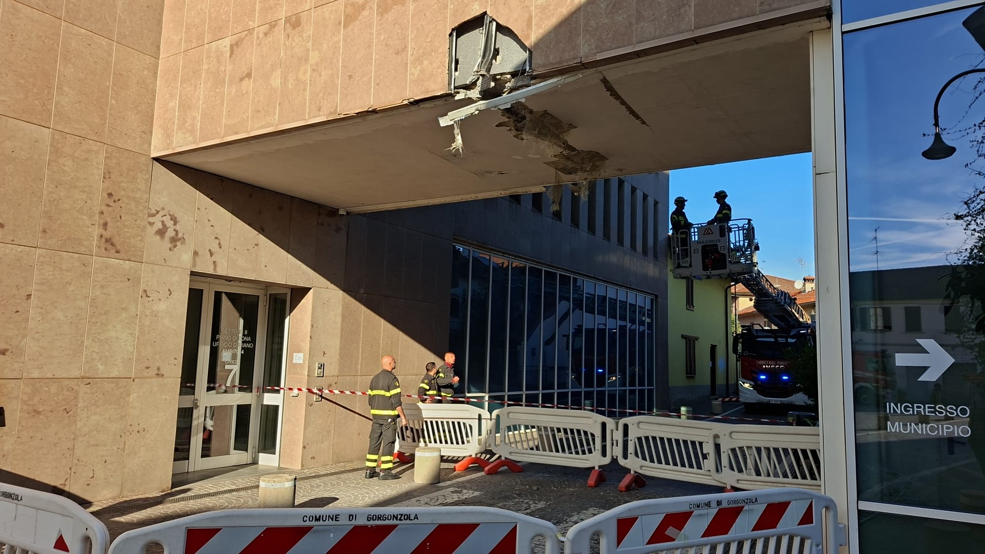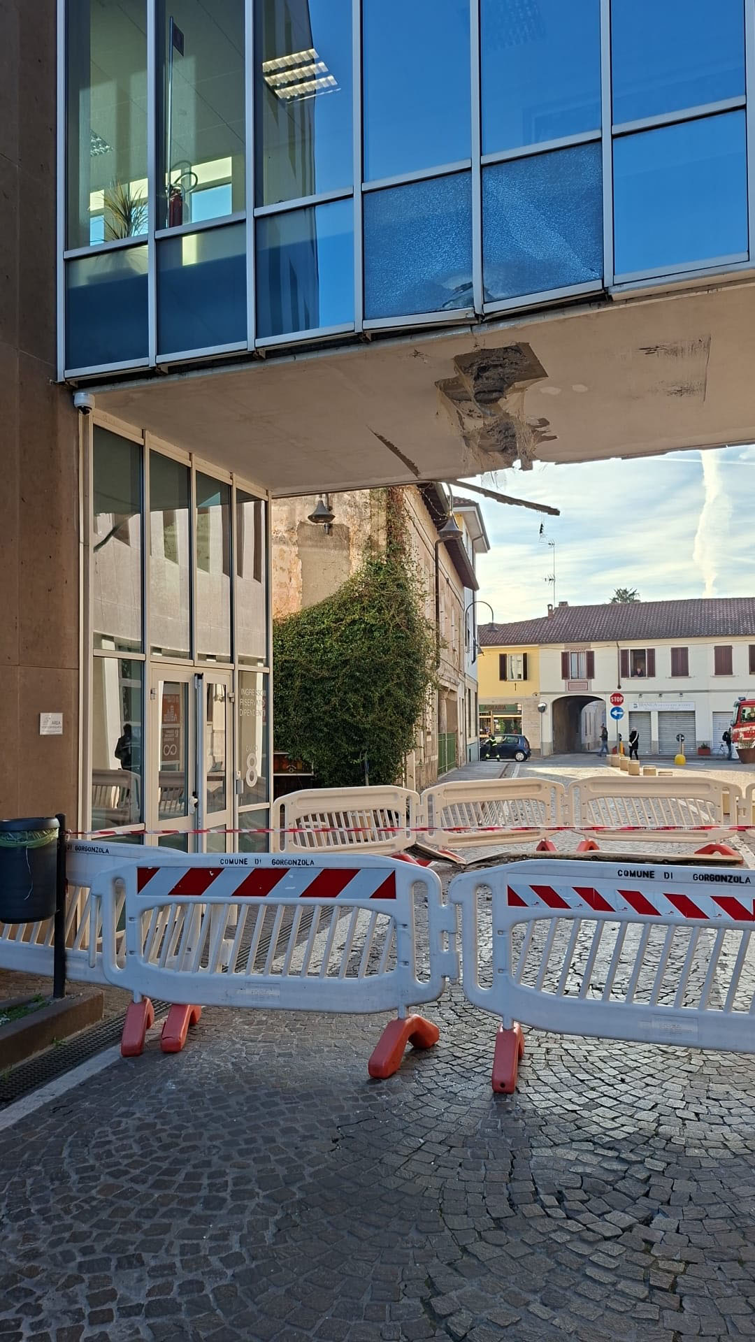 Alle 7:30 di lunedì 27 ottobre 2025 è stata danneggiata la passerella sopraelevata del Municipio di Gorgonzola, struttura che fa da “ponte” sopra via Cesare Battisti e collega le due ali della Casa comunale.