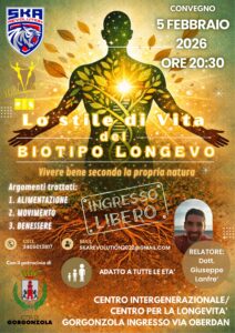Giovedì 5 febbraio 2026 alle ore 20:30, presso il Centro per la longevità si terrà un incontro pubblico a ingresso libero dedicato al tema del benessere e degli stili di vita salutari, con la partecipazione del dott. Giuseppe Lanfré.